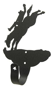 Product Description : Description: This wall mountable hook features a silhouette of a bronc buster at the top. Works great for hanging coats, and is heavy enough for use in the garage for hanging extension cords and other items. Laser cut for the best quality and detail. Mounting hardware included. Size: 5" x 8" x 2-1/4"D. Material:14 gauge steel. Finish: Black wrinkle powder coat.