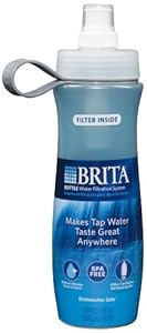 Product Description : Color: BlueBrita Water Bottle with FilterDrink cleaner*, refreshing water on the go--wherever you go.Now you can get great-tasting water on the go, without the cost and waste of bottled water. Just reach for the reusable, BPA-free Brita Bottle. The Brita Bottle lets you drink delicious, cleaner* filtered water anywhere--whether exploring a new city, spending a day at the beach, running errands, or simply relaxing at home or working in the garden. Just fill with ordinary tap water and the in-bottle filter instantly reduces chlorine, bad tastes, and odors**, so all you get is pure refreshing water.Conveniently designed, the bottle provides a pull-up drink nozzle with a hygienic cover for easy sipping and a clean, tight seal when not in use. It also comes with a finger loop for effortless transport and sleek, slightly indented sides for a comfortable hold. The bottle holds 20 ounces of water and measures approximately 3 by 3 by 9 inches. The reusable water bottle with built-in filter.Your personal source of great-tasting water on the go!HighlightsNSF certified to reduce chlorine taste and odor** BPA-free 1 filter can replace 150 plastic bottles*** 20-ounce reusable bottle Convenient filter-change reminder right on the bottle Pull-up drink nozzle with hygienic cover Leak-proof bottle design Dishwasher-safe (top shelf only) Recyclable bottle Filter recyclable separately by mail or at limited drop-off locations**** Easy-to-carry finger loop DirectionsWash bottle in warm water and mild detergent before use. Do not put in dishwasher. Screw small cap into large cap to lock filter in place. Fill bottle with tap water. Screw large cap with filter onto bottle. Pull up on large spout to open. Squeeze one full bottle of water through the filter to remove carbon dust. System is now ready for use. *Certified to reduce lead. **Substances reduced may not be in all users' water. ***Standard 16.9-ounce bottles. ****Filter housing may be recycled through the Preserve program by mail or at limited retailers participating in the Preserve program. Filter contents are converted into energy by Preserve. Consumer responsible for mailing costs. See www.brita.com/support/filter-recycling/ for details.