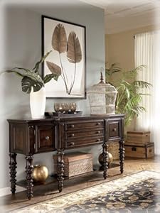 Product Description : : The rich beauty of the "Key Town" dining room collection features a sophisticated finish and ornate details to create a traditional designed collection that is sure to enhance any home's decor. The dark brown finish, flowing over the ash swirl accents, features a gentle distressing that perfectly complements the dark bronze color hardware and embossed recycled leather accentson the server. Matching items available. May require assembly.