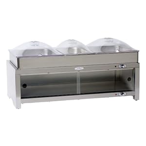 Product Description : Amazon.com Product Description : Housed in durable stainless steel, this commercial-quality warming cabinet keeps plates warm and side dishes, casseroles, and more at a perfect serving temperature. The lower cabinet works great as a food warmer or a plate warmer, holding up to 12 large plates (not included), while the top level functions as a family-size buffet server. Two adjustable thermostats, one for each level, allow for setting the heat from 155 to 205 degrees F, while the unit's stainless-steel chafing-pan holder effectively conserves heat and holds the pans in place on the top warming surface. Accessories include three chafing pans--two 4-2/7-quart chafing pans that hold up to 40 4-ounce servings and one 2-3/5-quart chafing pan that holds up to 25 4-ounce servings, plus matching clear polycarbonate lids with utensil slots. Other highlights include safety signal lights, four non-skid feet, and an easy-to-clean design. Made in the USA, the 600-watt warming cabinet with buffet server measures 15-1/4 by 27-5/8 by 14 inches and carries a two-year parts-and-labor warranty. Product Description : Keep plates, dishes, casseroles, etc. warm until you're ready to serve!